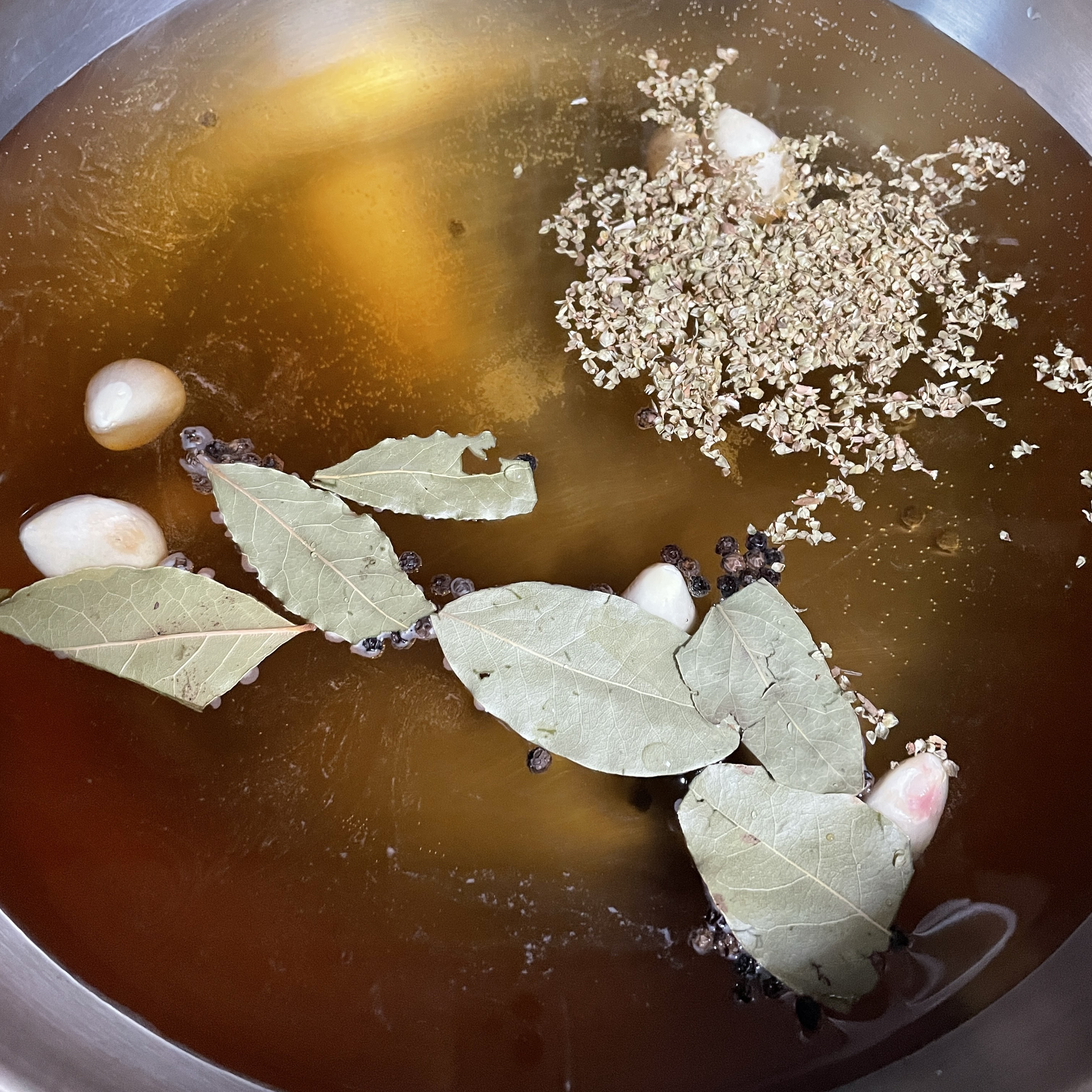 커피, 후추, 월계수 잎, 오레가노, 마늘을 넣고 초벌하였습니다.
