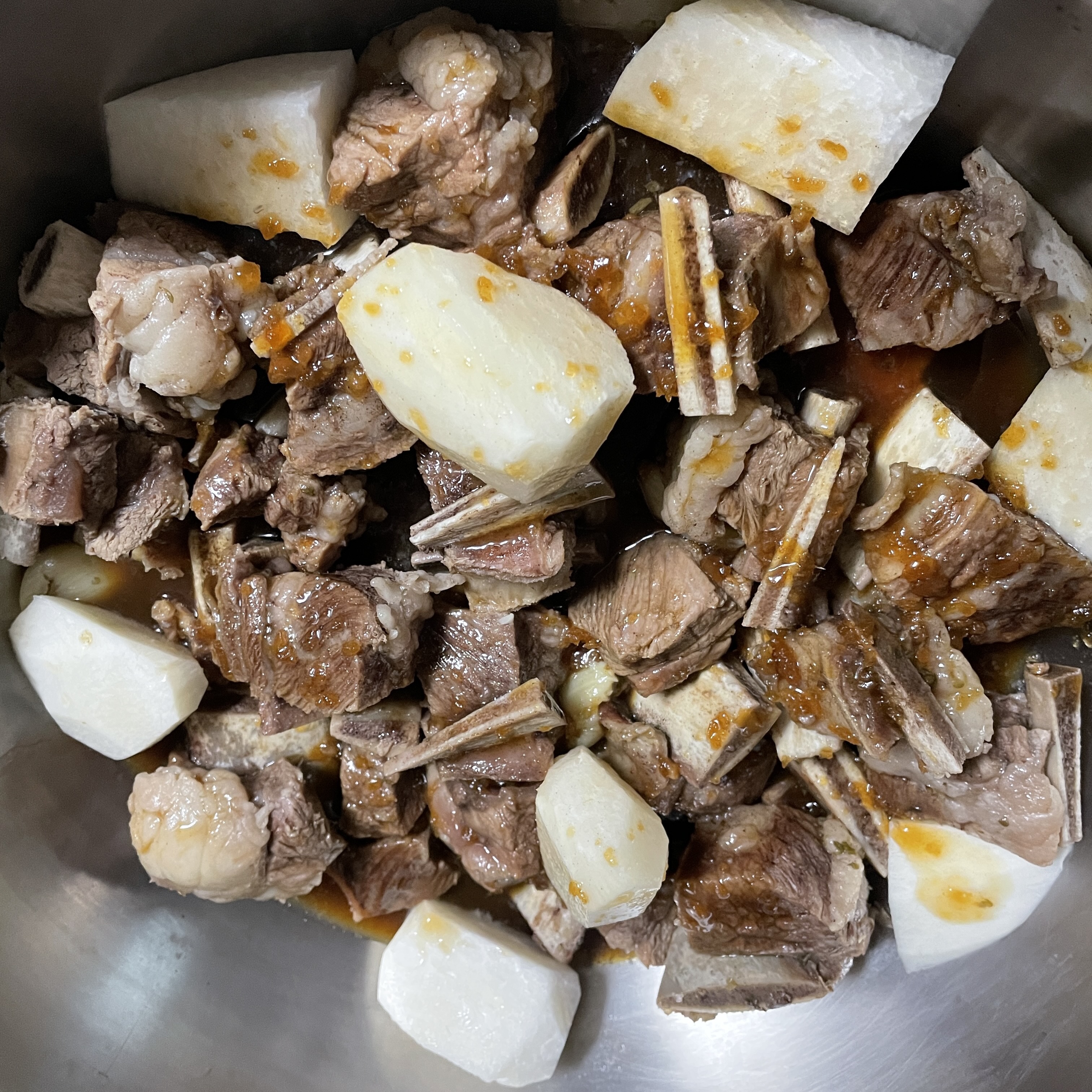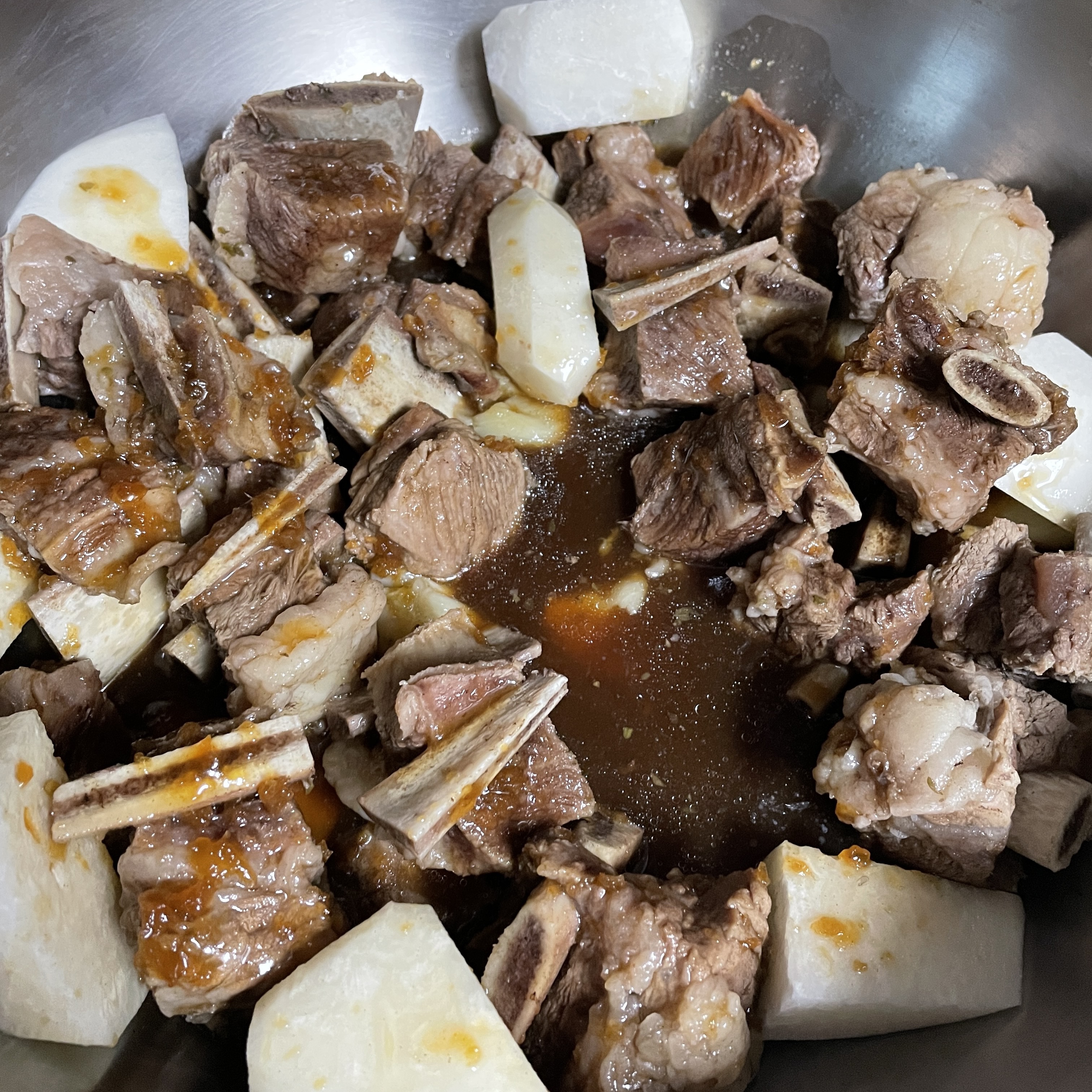 갈비, 무, 갈비양념을 분량대로 넣고 1시간 끓여주세요!