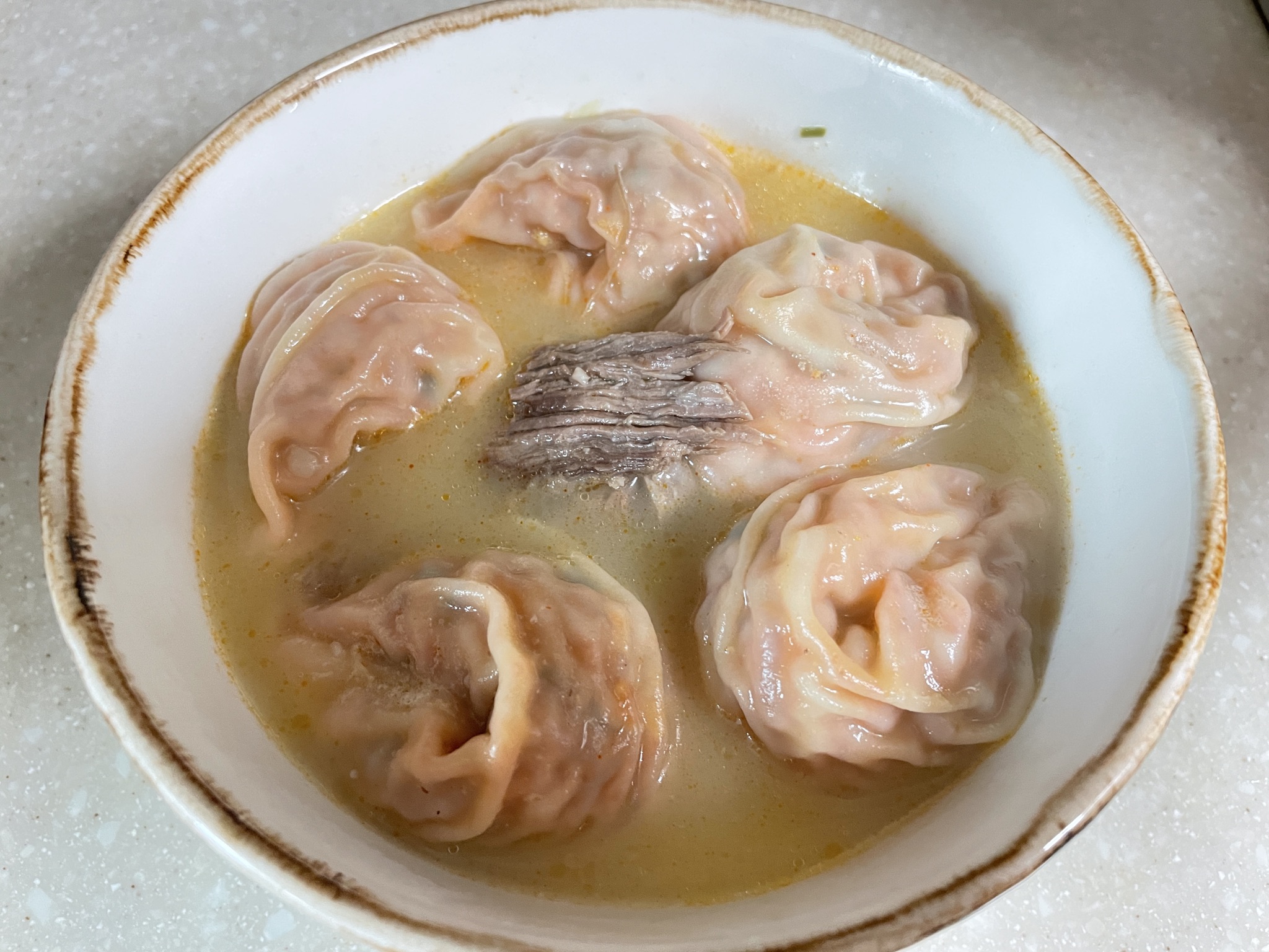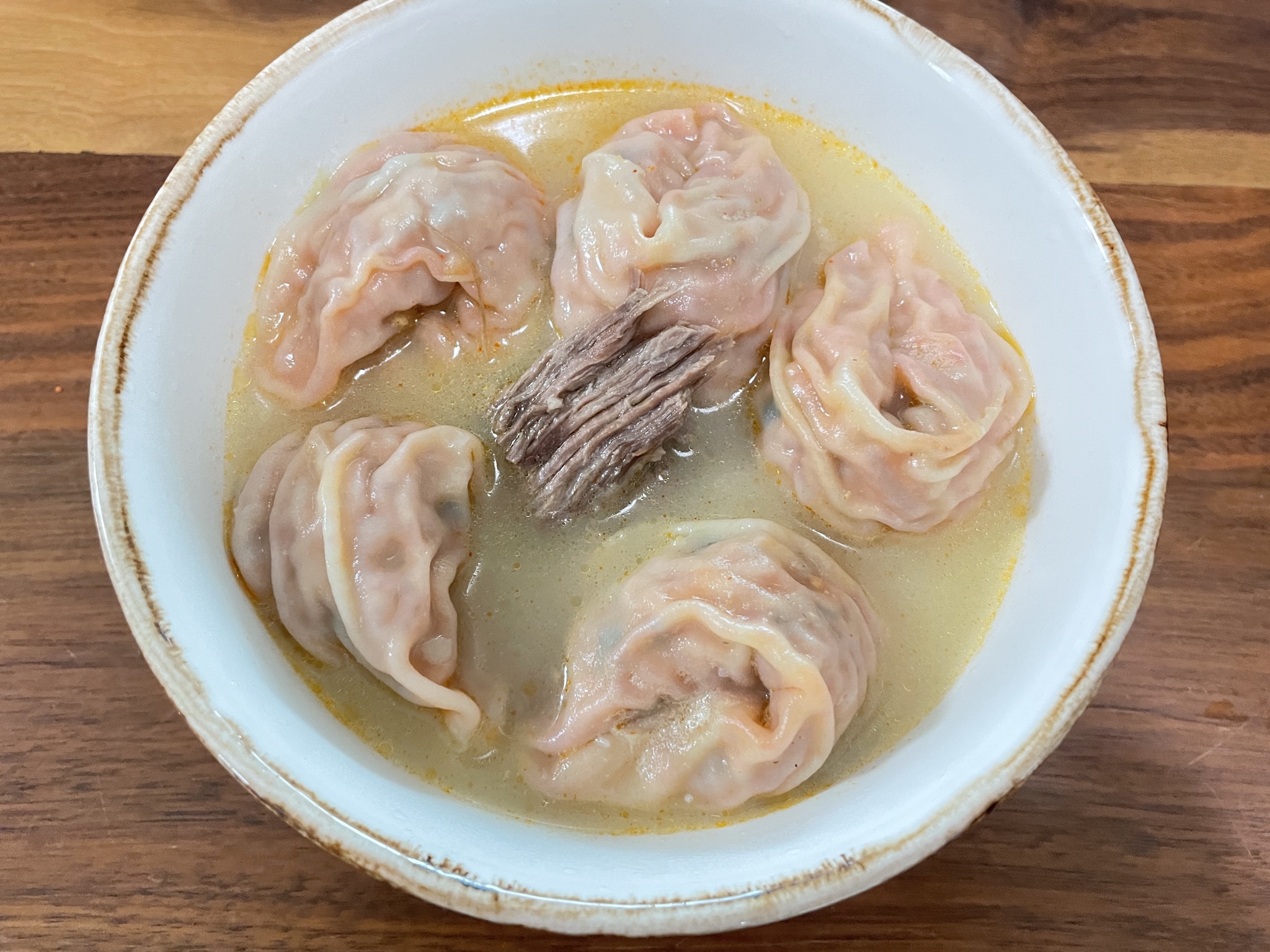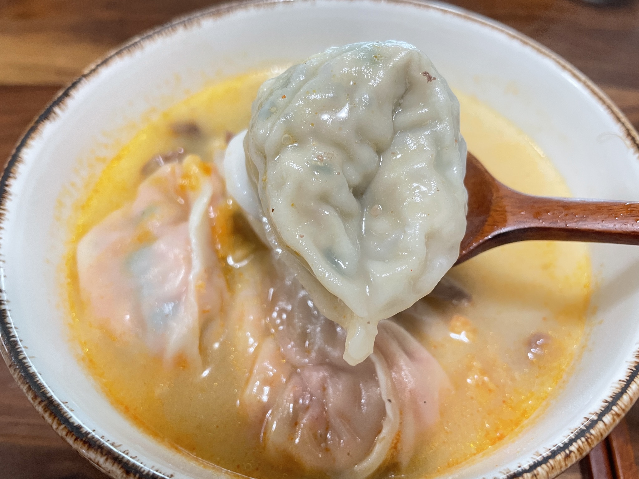 김치 만두를 하나 터트려서 국물이 빨개졌어요.