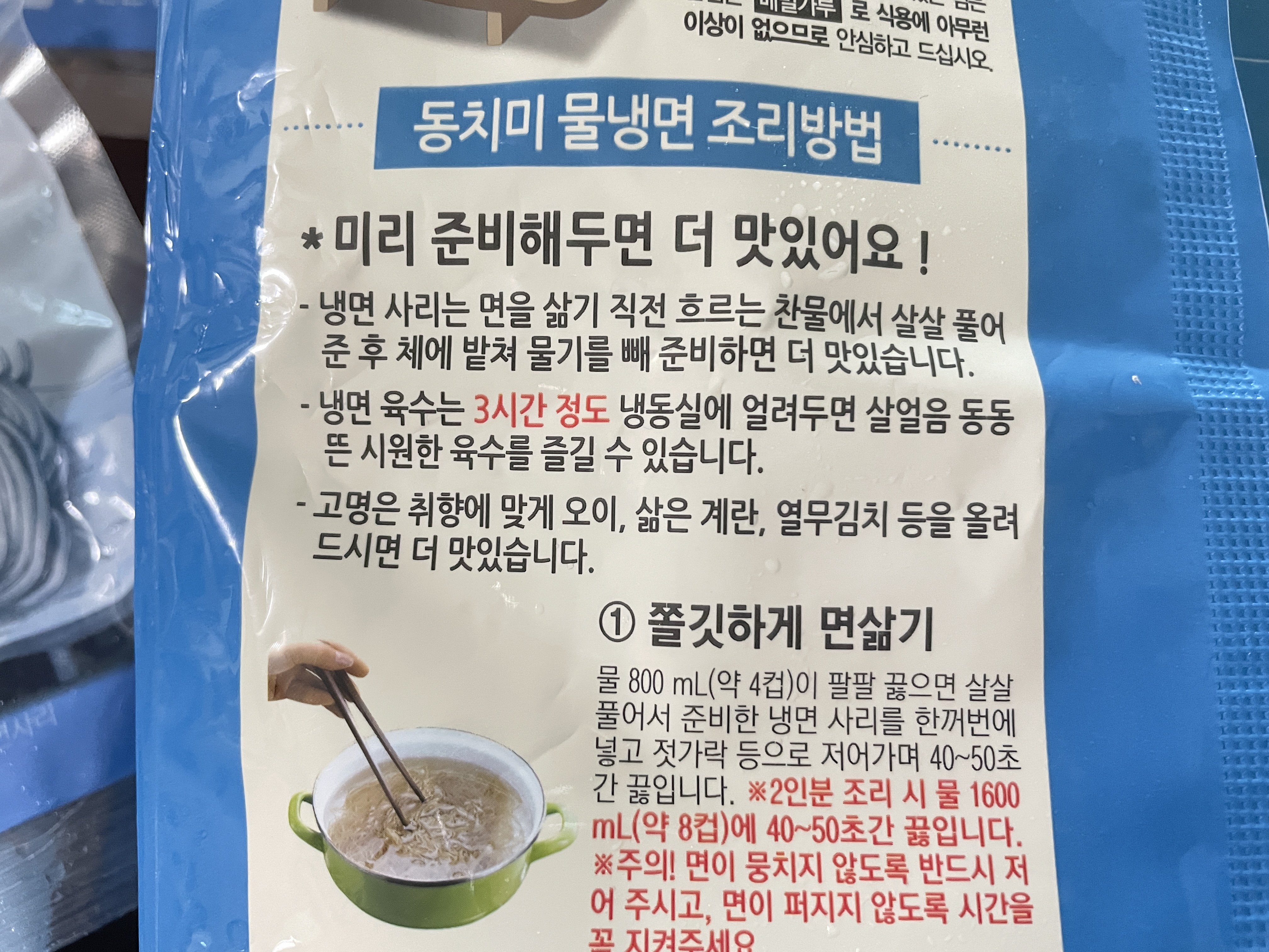 냉면 면은 엄청 짧게 삶는거 아시죠 40~50초 이내로 삶아주세요.