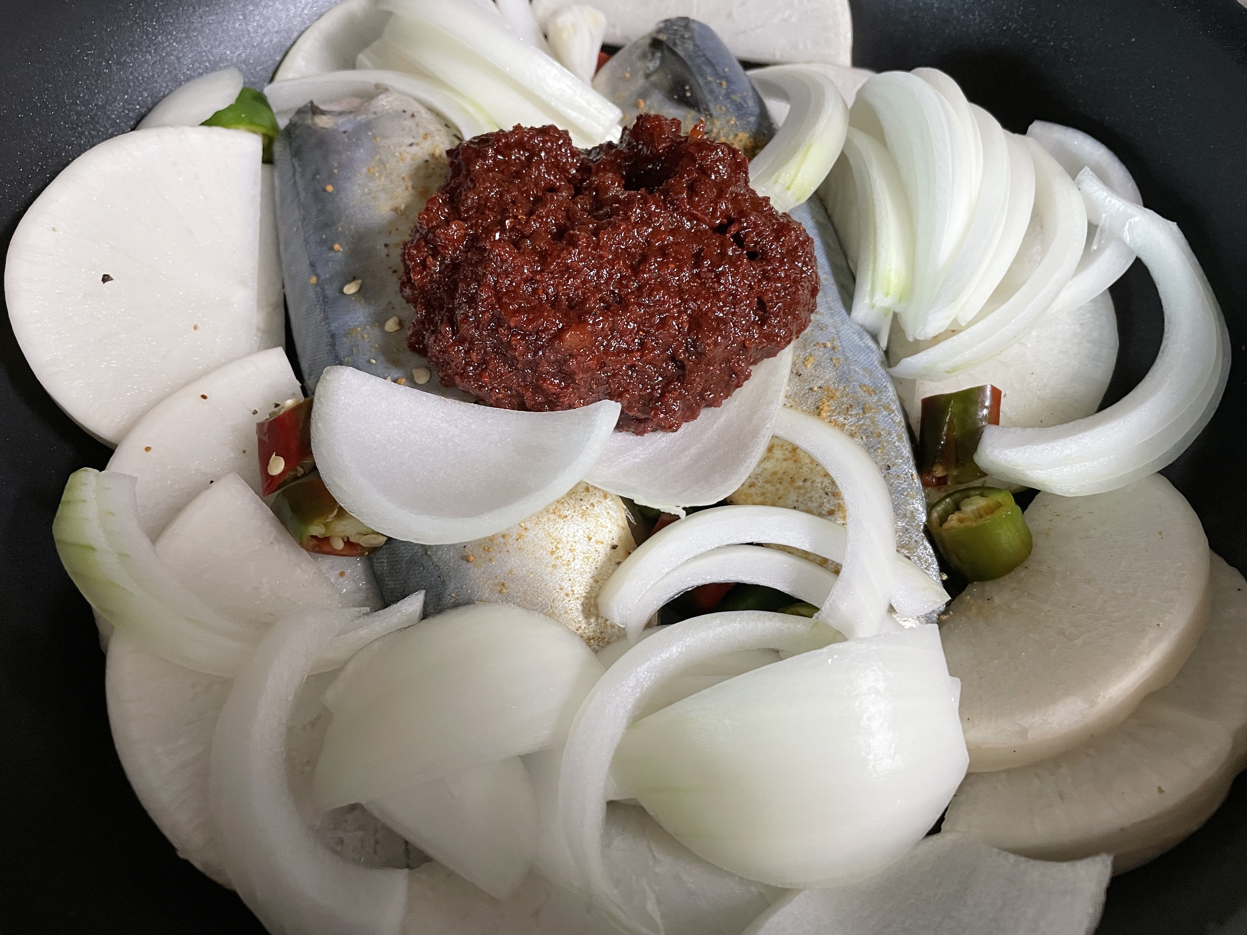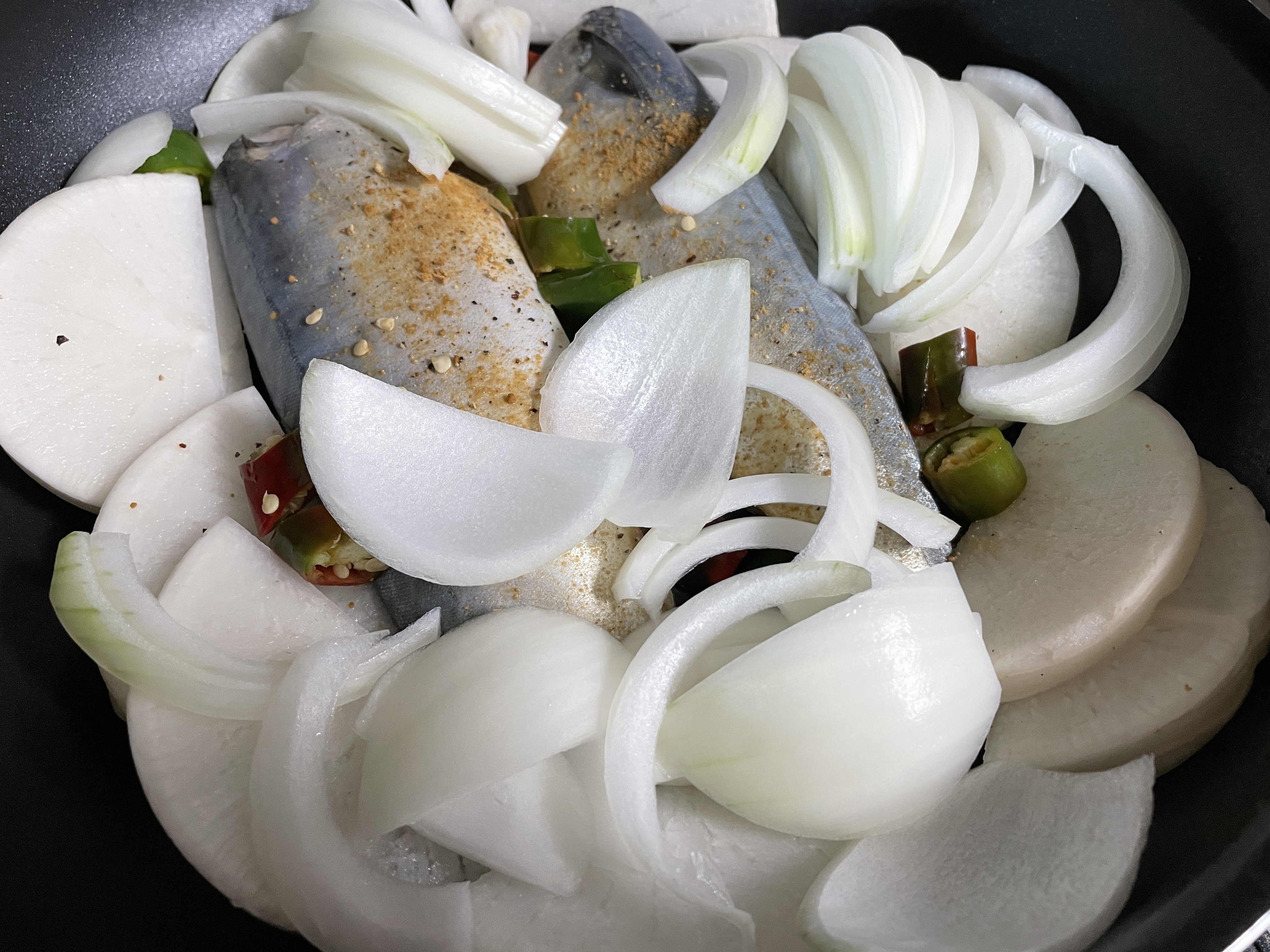 고등어 2미, 무, 양파, 고추, 파를 준비해주었습니다.