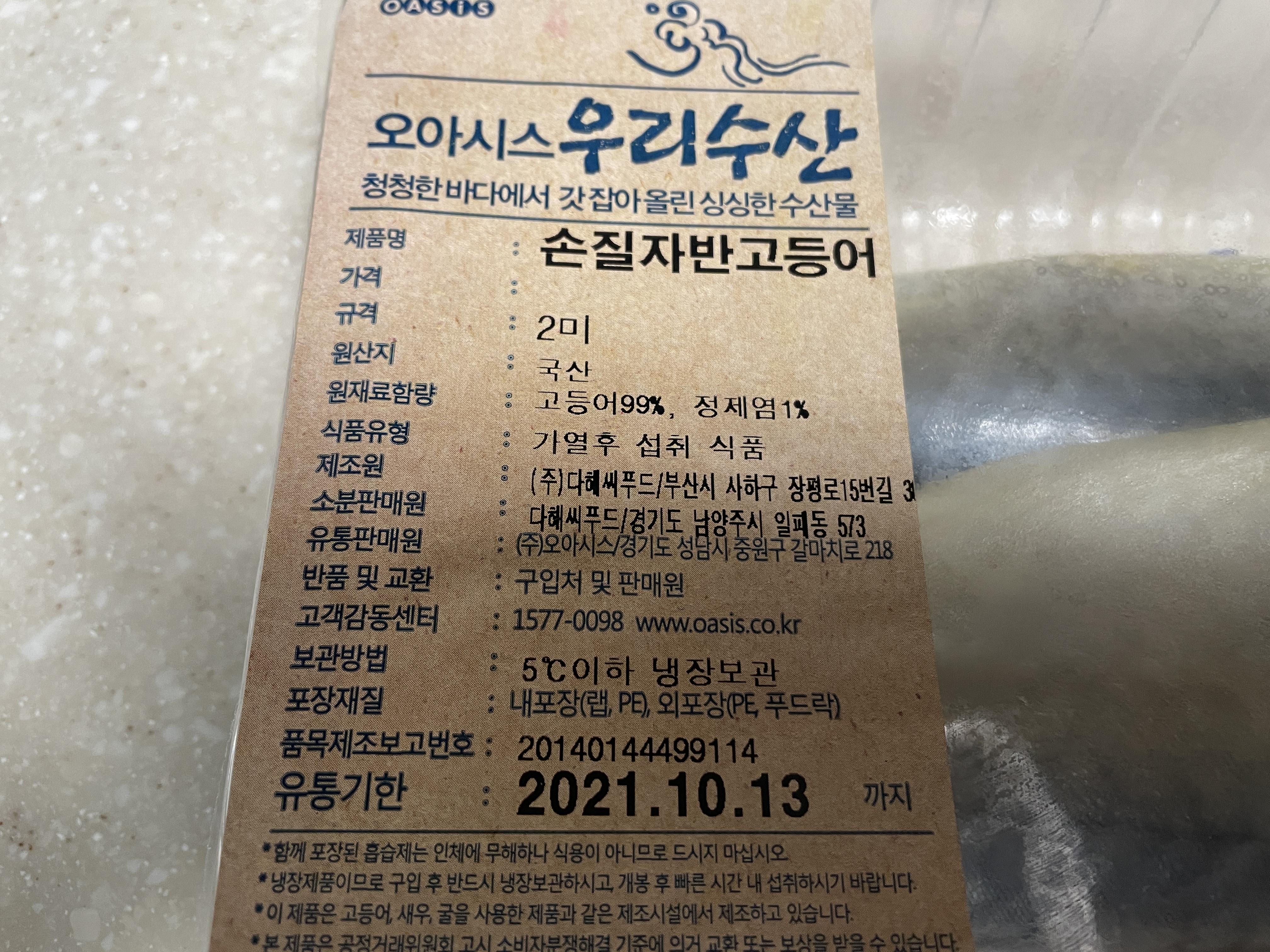 고등어 99%, 정제염 1%가 들어있는 국산 손질 자반 고등어